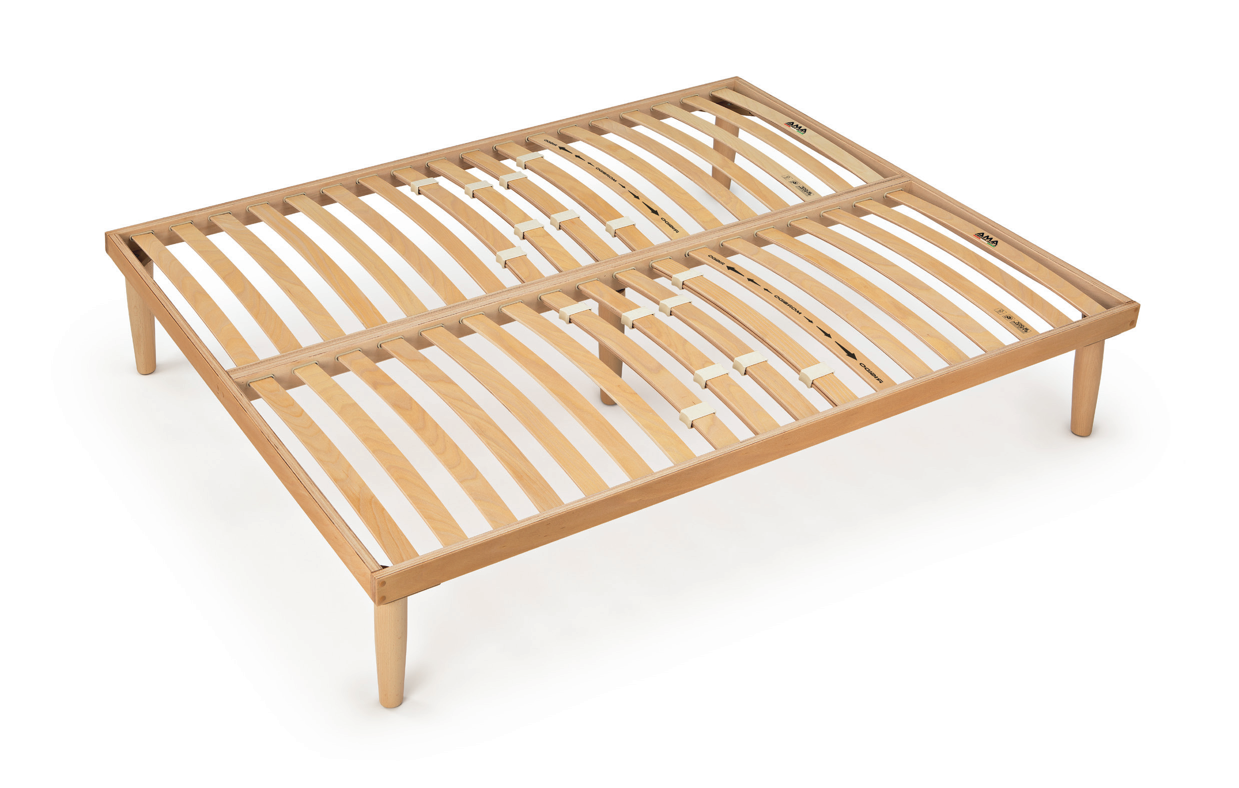 La rete a doghe modello Arnica si presenta con un telaio in multistrato di faggio con profilo 60x25 mm trattato con olio paglierino e cera d’api.